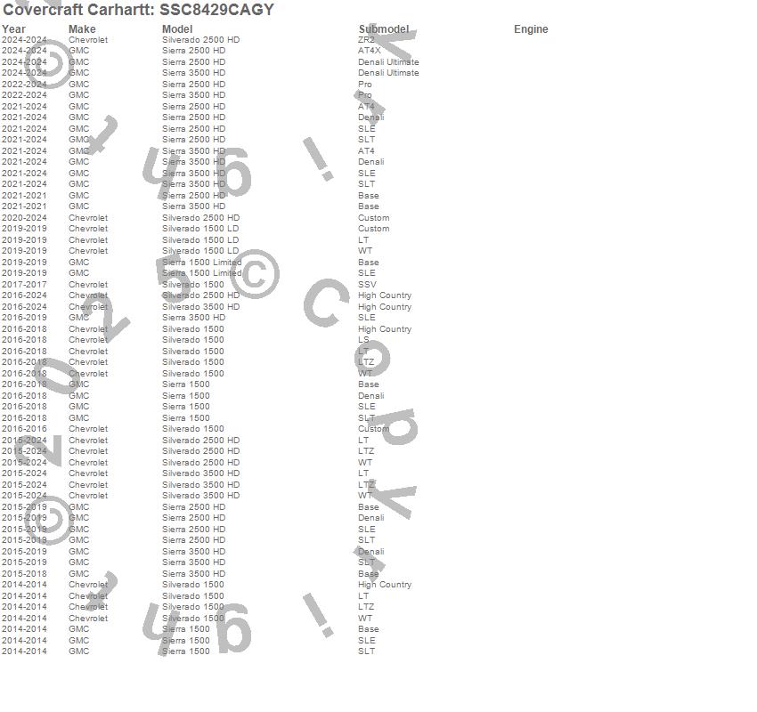 Below is an abbreviated list of applications for the Covercraft Carhartt SeatSaver.Sierra 1500, Sierra 1500 Limited, Sierra 2500 HD, Sierra 3500 HD, Silverado 1500, Silverado 1500 LD, Silverado 2500 HD, Silverado 3500 HD, Chevrolet, GMC, 2024, 2023, 2022, 2021, 2020, 2019, 2018, 2017, 2016, 2015