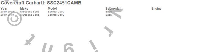 Below is an abbreviated list of applications for the Covercraft Carhartt SeatSaver.Sprinter 2500, Sprinter 3500, Mercedes-Benz, 2015, 2014, 2013, 2012, 2011, 2010