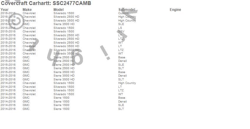 Below is an abbreviated list of applications for the Covercraft Carhartt SeatSaver.Sierra 1500, Sierra 2500 HD, Sierra 3500 HD, Silverado 1500, Silverado 2500 HD, Silverado 3500 HD, Chevrolet, GMC, 2016, 2015, 2014