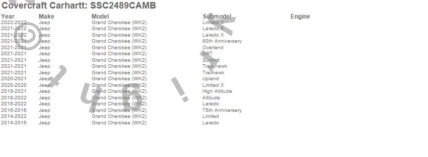 Below is an abbreviated list of applications for the Covercraft Carhartt SeatSaver.Grand Cherokee (WK2), Jeep, 2022, 2021, 2020, 2019, 2018, 2017, 2016, 2015, 2014