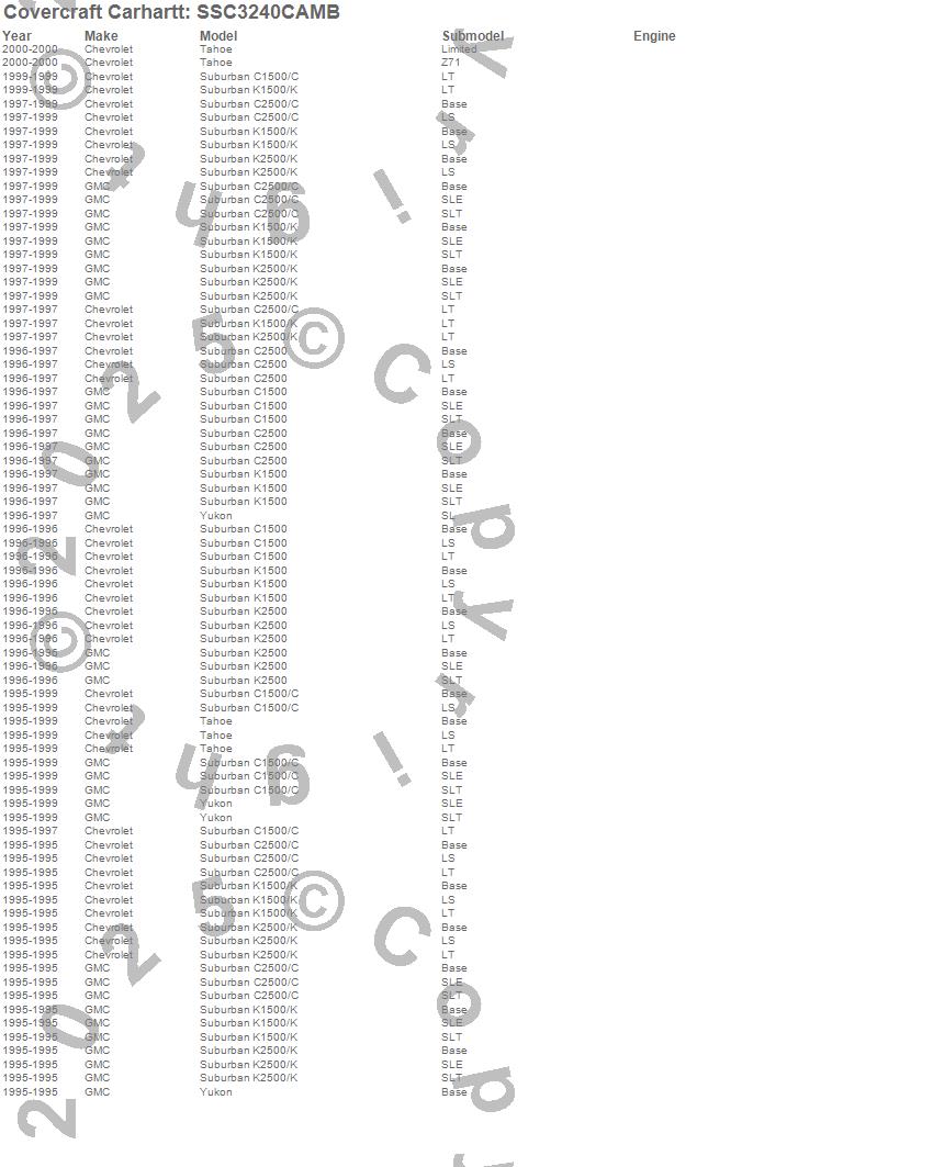 Below is an abbreviated list of applications for the Covercraft Carhartt SeatSaver.C1500 Suburban, C2500 Suburban, K1500 Suburban, K2500 Suburban, Tahoe, Yukon, Chevrolet, GMC, 2000, 1999, 1998, 1997, 1996, 1995