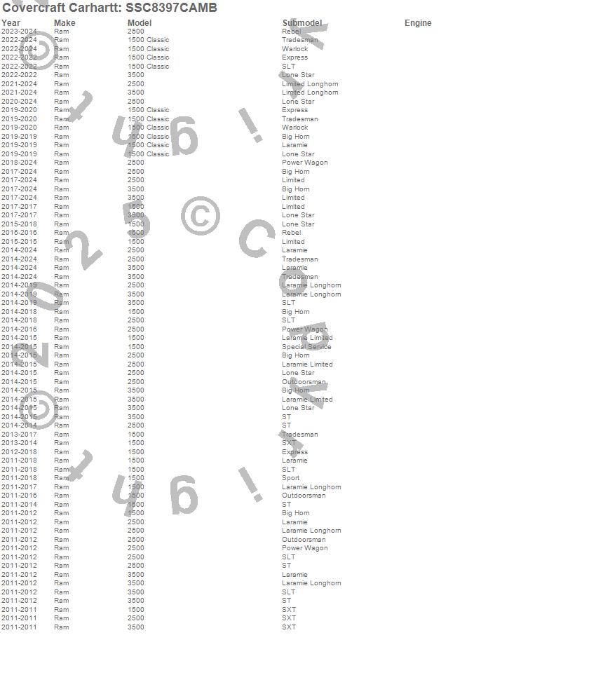 Below is an abbreviated list of applications for the Covercraft Carhartt SeatSaver.1500, 1500 Classic, 2500, 3500, Ram, 2025, 2024, 2023, 2022, 2021, 2020, 2019, 2018, 2017, 2016, 2015, 2014, 2013, 2012, 2011