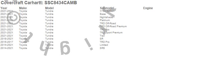 Below is an abbreviated list of applications for the Covercraft Carhartt SeatSaver.Tundra, Toyota, 2021, 2020, 2019, 2018, 2017, 2016, 2015, 2014