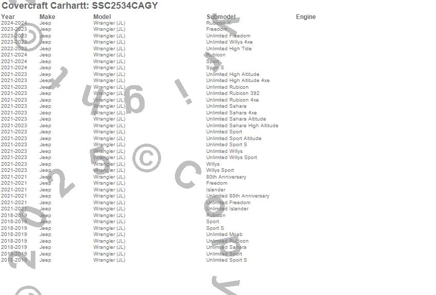 Below is an abbreviated list of applications for the Covercraft Carhartt SeatSaver.Wrangler (JL), Jeep, 2025, 2024, 2023, 2022, 2021, 2020, 2019, 2018