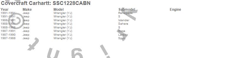 Below is an abbreviated list of applications for the Covercraft Carhartt SeatSaver.Wrangler (YJ), Jeep, 1991, 1990, 1989, 1988, 1987