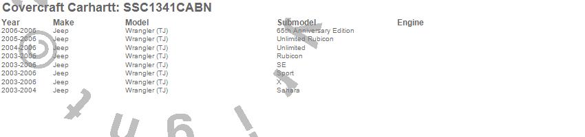 Below is an abbreviated list of applications for the Covercraft Carhartt SeatSaver.Wrangler (TJ), Jeep, 2006, 2005, 2004, 2003