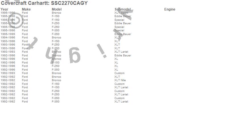 Below is an abbreviated list of applications for the Covercraft Carhartt SeatSaver.Bronco, F-150, F-250, F-350, Ford, 1996, 1995, 1994, 1993, 1992