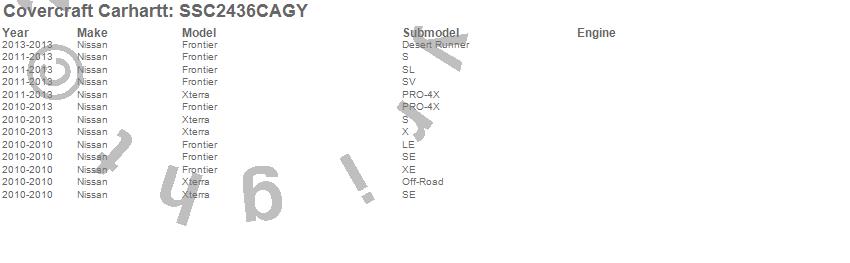 Below is an abbreviated list of applications for the Covercraft Carhartt SeatSaver.Frontier, Xterra, Nissan, 2013, 2012, 2011, 2010