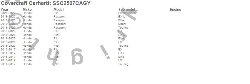 Below is an abbreviated list of applications for the Covercraft Carhartt SeatSaver.Passport, Pilot, Honda, 2020, 2019, 2017, 2016