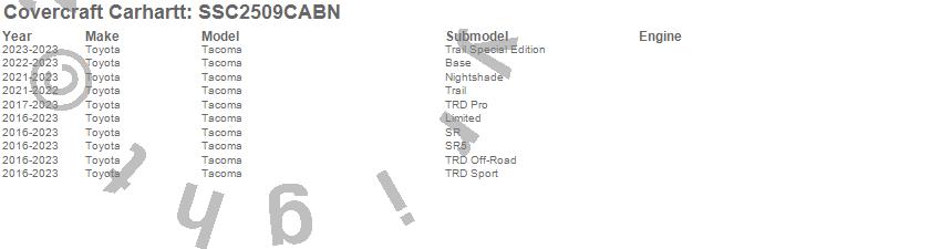 Below is an abbreviated list of applications for the Covercraft Carhartt SeatSaver.Tacoma, Toyota, 2023, 2022, 2021, 2020, 2019, 2018, 2017, 2016