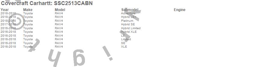 Below is an abbreviated list of applications for the Covercraft Carhartt SeatSaver.RAV4, Toyota, 2018, 2017, 2016