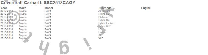Below is an abbreviated list of applications for the Covercraft Carhartt SeatSaver.RAV4, Toyota, 2018, 2017, 2016
