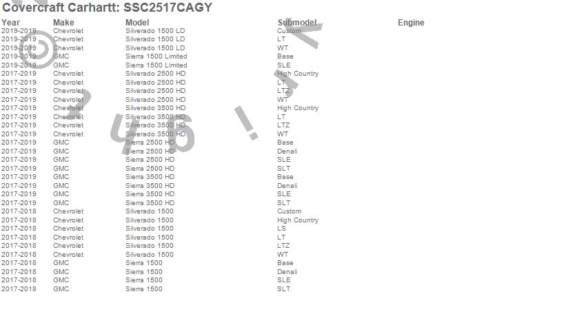 Below is an abbreviated list of applications for the Covercraft Carhartt SeatSaver.Sierra 1500, Sierra 1500 Limited, Sierra 2500 HD, Sierra 3500 HD, Silverado 1500, Silverado 1500 LD, Silverado 2500 HD, Silverado 3500 HD, Chevrolet, GMC, 2019, 2018, 2017
