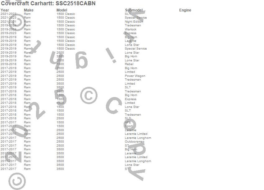 Below is an abbreviated list of applications for the Covercraft Carhartt SeatSaver.1500, 1500 Classic, 2500, 3500, Ram, 2024, 2023, 2022, 2021, 2020, 2019, 2018, 2017