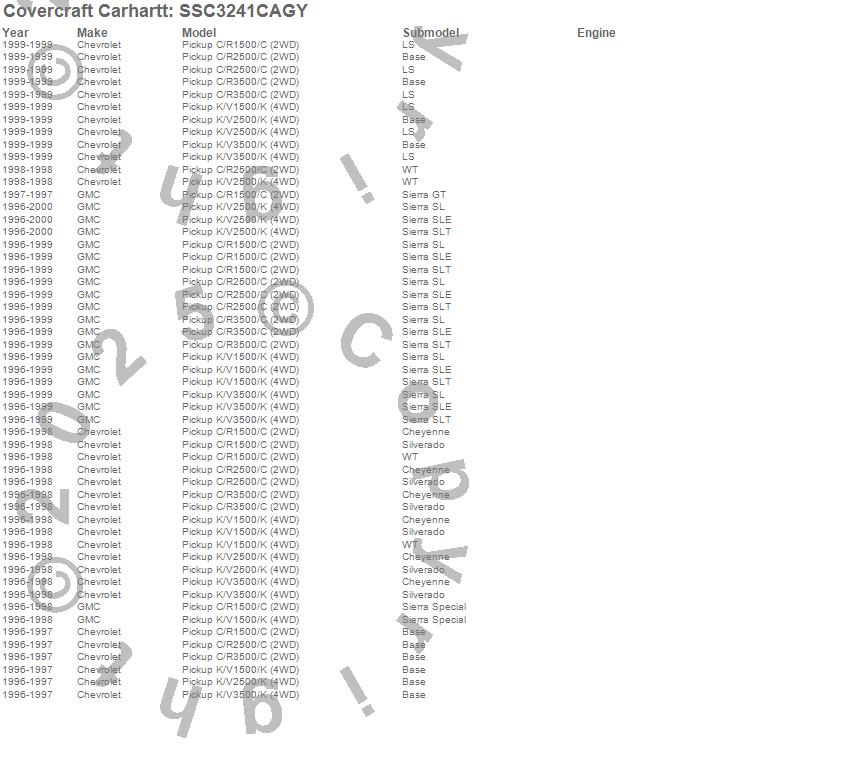 Below is an abbreviated list of applications for the Covercraft Carhartt SeatSaver.C1500 Pickup, C2500 Pickup, C3500 Pickup, K1500 Pickup, K2500 Pickup, K3500 Pickup, Chevrolet, GMC, 2000, 1999, 1998, 1997, 1996