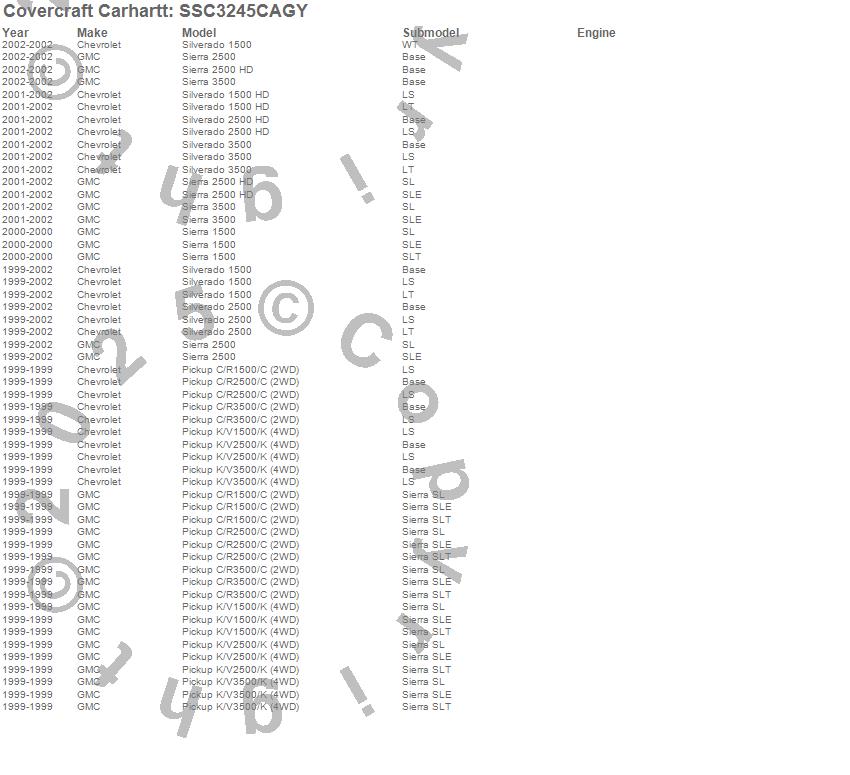 Below is an abbreviated list of applications for the Covercraft Carhartt SeatSaver.C1500 Pickup, C2500 Pickup, C3500 Pickup, K1500 Pickup, K2500 Pickup, K3500 Pickup, Sierra 1500, Sierra 2500, Sierra 2500 HD, Sierra 3500, Silverado 1500, Silverado 1500 HD, Silverado 2500, Silverado 2500 HD, Silverado 3500, Chevrolet, GMC, 2002, 2001, 2000