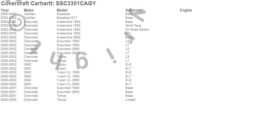 Below is an abbreviated list of applications for the Covercraft Carhartt SeatSaver.Avalanche 1500, Avalanche 2500, Escalade, Escalade EXT, Suburban 1500, Suburban 2500, Tahoe, Yukon, Yukon XL 1500, Yukon XL 2500, Cadillac, Chevrolet, GMC, 2002, 2001, 2000