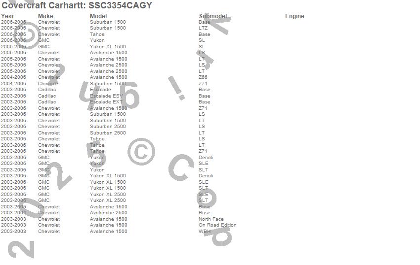 Below is an abbreviated list of applications for the Covercraft Carhartt SeatSaver.Avalanche 1500, Avalanche 2500, Escalade, Escalade ESV, Escalade EXT, Suburban 1500, Suburban 2500, Tahoe, Yukon, Yukon XL 1500, Yukon XL 2500, Cadillac, Chevrolet, GMC, 2006, 2005, 2004, 2003