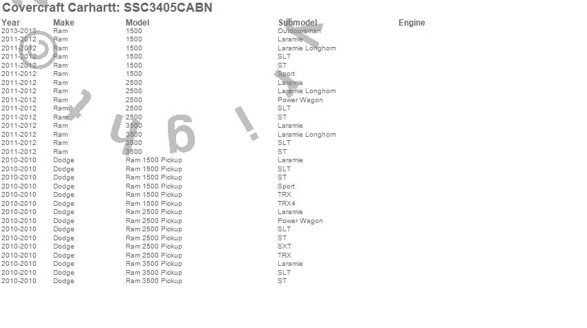Below is an abbreviated list of applications for the Covercraft Carhartt SeatSaver.1500, 2500, 3500, Ram 1500, Ram 2500, Ram 3500, Dodge, Ram, 2013, 2012, 2011, 2010