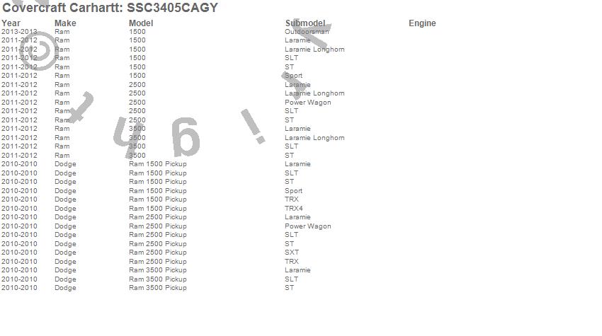 Below is an abbreviated list of applications for the Covercraft Carhartt SeatSaver.1500, 2500, 3500, Ram 1500, Ram 2500, Ram 3500, Dodge, Ram, 2013, 2012, 2011, 2010