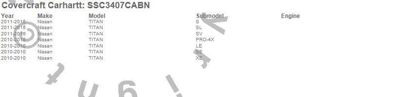 Below is an abbreviated list of applications for the Covercraft Carhartt SeatSaver.TITAN, Nissan, 2015, 2014, 2013, 2012, 2011, 2010
