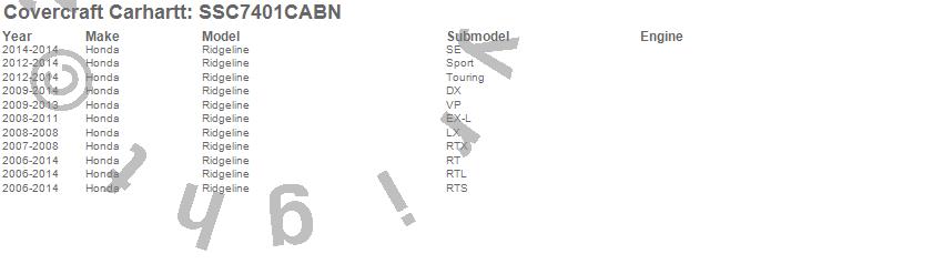 Below is an abbreviated list of applications for the Covercraft Carhartt SeatSaver.Ridgeline, Honda, 2014, 2013, 2012, 2011, 2010, 2009, 2008, 2007, 2006