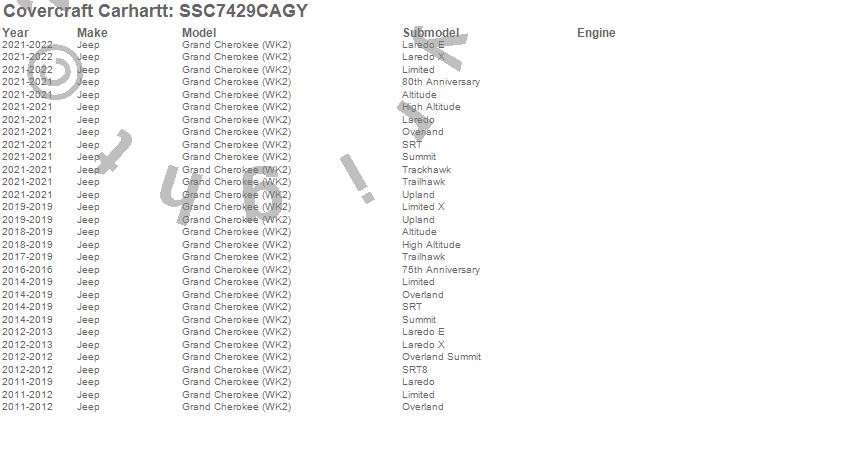 Below is an abbreviated list of applications for the Covercraft Carhartt SeatSaver.Grand Cherokee (WK2), Jeep, 2022, 2021, 2020, 2019, 2018, 2017, 2016, 2015, 2014, 2013, 2012, 2011