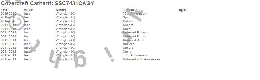 Below is an abbreviated list of applications for the Covercraft Carhartt SeatSaver.Wrangler (JK), Jeep, 2016, 2015, 2014, 2013, 2012, 2011