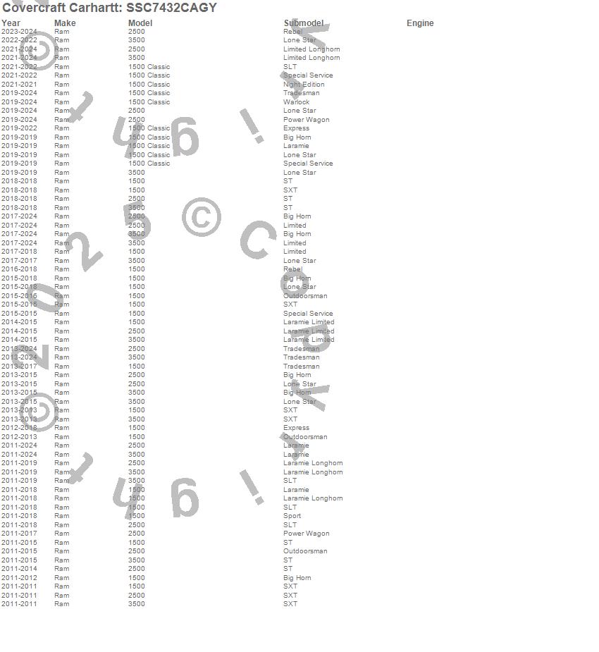 Below is an abbreviated list of applications for the Covercraft Carhartt SeatSaver.1500, 1500 Classic, 2500, 3500, Ram, 2025, 2024, 2023, 2022, 2021, 2020, 2019, 2018, 2017, 2016, 2015, 2014, 2013, 2012, 2011