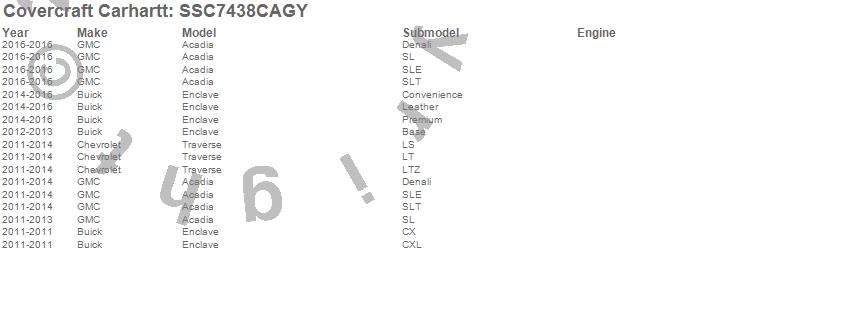 Below is an abbreviated list of applications for the Covercraft Carhartt SeatSaver.Acadia, Enclave, Traverse, Buick, Chevrolet, GMC, 2016, 2015, 2014, 2013, 2012, 2011
