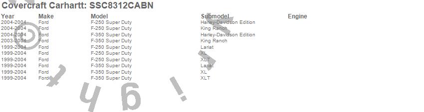 Below is an abbreviated list of applications for the Covercraft Carhartt SeatSaver.F-250 Super Duty, F-350 Super Duty, Ford, 2004, 2003, 2002, 2001, 2000, 1999