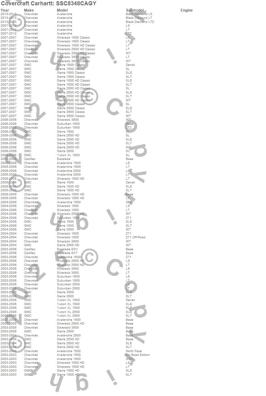 Below is an abbreviated list of applications for the Covercraft Carhartt SeatSaver.Avalanche, Avalanche 1500, Avalanche 2500, Escalade, Escalade ESV, Escalade EXT, Sierra 1500, Sierra 1500 Classic, Sierra 1500 HD, Sierra 1500 HD Classic, Sierra 2500 HD, Sierra 2500 HD Classic, Sierra 3500, Sierra 3500 Classic, Silverado 1500, Silverado 1500 Classic, Silverado 1500 HD, Silverado 1500 HD Classic, Silverado 2500 HD, Silverado 2500 HD Classic
