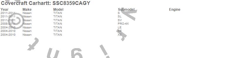 Below is an abbreviated list of applications for the Covercraft Carhartt SeatSaver.TITAN, Nissan, 2011, 2010, 2009, 2008, 2007, 2006, 2005, 2004