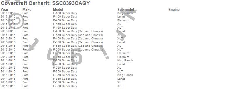 Below is an abbreviated list of applications for the Covercraft Carhartt SeatSaver.F-250 Super Duty, F-350 Super Duty, F-450 Super Duty, F-550 Super Duty, Ford, 2016, 2015, 2014, 2013, 2012, 2011