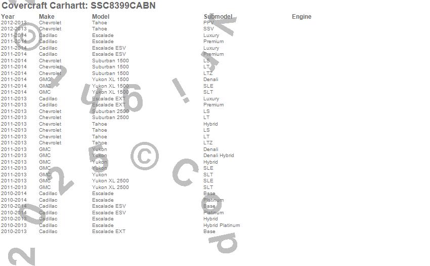 Below is an abbreviated list of applications for the Covercraft Carhartt SeatSaver.Escalade, Escalade ESV, Escalade EXT, Suburban 1500, Suburban 2500, Tahoe, Yukon, Yukon XL 1500, Yukon XL 2500, Cadillac, Chevrolet, GMC, 2014, 2013, 2012, 2011, 2010
