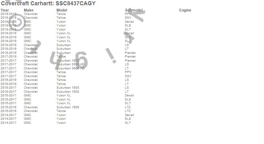Below is an abbreviated list of applications for the Covercraft Carhartt SeatSaver.Suburban, Suburban 1500, Suburban 3500 HD, Tahoe, Yukon, Yukon XL, Chevrolet, GMC, 2020, 2019, 2018, 2017, 2016, 2015, 2014