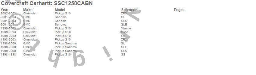 Below is an abbreviated list of applications for the Covercraft Carhartt SeatSaver.S10 Pickup, Sonoma, Chevrolet, GMC, 2003, 2002, 2001, 2000, 1999, 1998