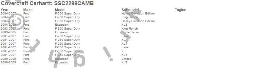Below is an abbreviated list of applications for the Covercraft Carhartt SeatSaver.Excursion, F-250 Super Duty, F-350 Super Duty, Ford, 2007, 2006, 2005, 2004, 2003, 2002, 2001, 2000