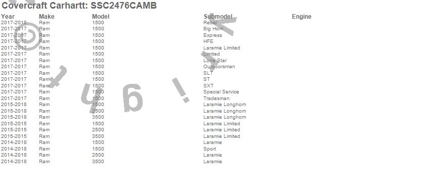 Below is an abbreviated list of applications for the Covercraft Carhartt SeatSaver.1500, 2500, 3500, Ram, 2018, 2017, 2016, 2015, 2014