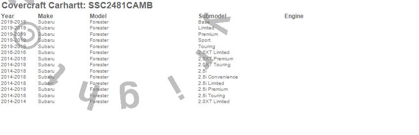 Below is an abbreviated list of applications for the Covercraft Carhartt SeatSaver.Forester, Subaru, 2019, 2018, 2017, 2016, 2015, 2014