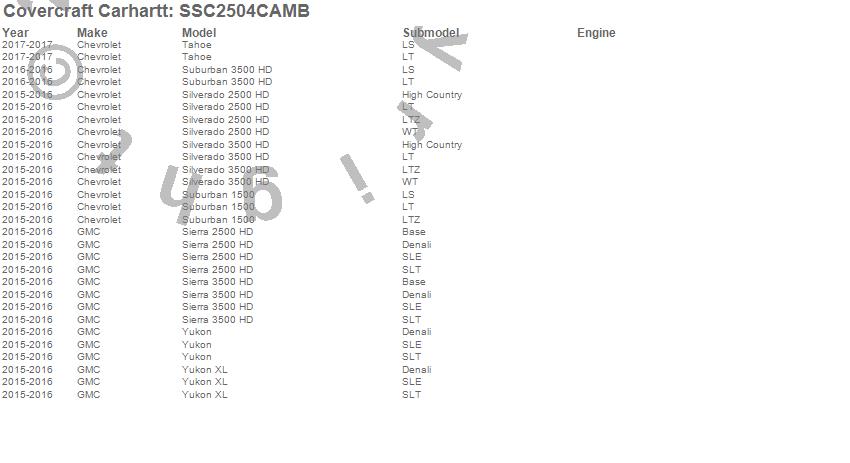 Below is an abbreviated list of applications for the Covercraft Carhartt SeatSaver.Sierra 2500 HD, Sierra 3500 HD, Silverado 2500 HD, Silverado 3500 HD, Suburban 1500, Suburban 3500 HD, Tahoe, Yukon, Yukon XL, Chevrolet, GMC, 2017, 2016, 2015