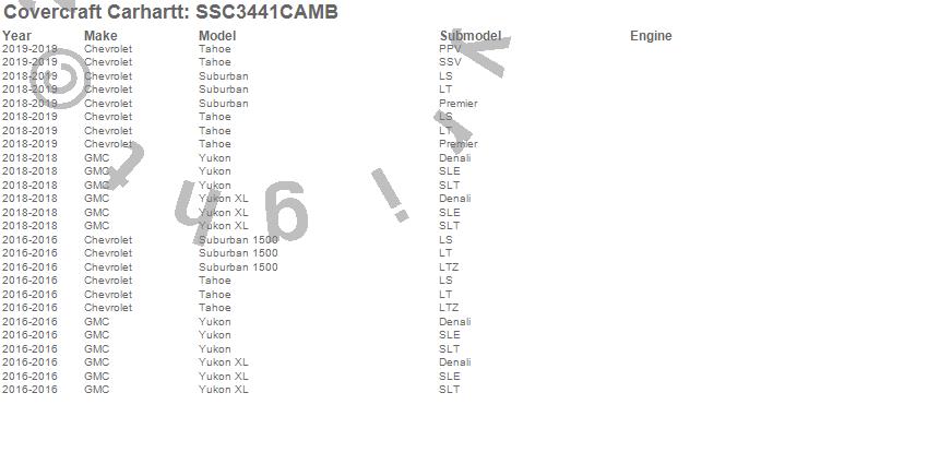 Below is an abbreviated list of applications for the Covercraft Carhartt SeatSaver.Suburban, Suburban 1500, Tahoe, Yukon, Yukon XL, Chevrolet, GMC, 2020, 2019, 2018, 2016