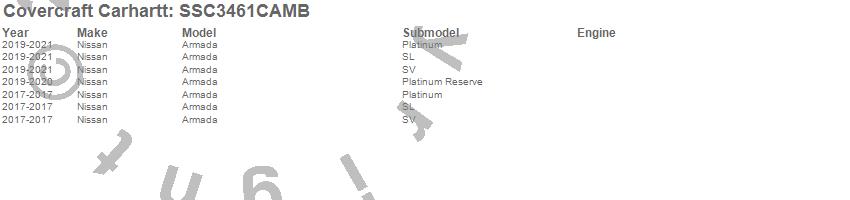 Below is an abbreviated list of applications for the Covercraft Carhartt SeatSaver.Armada, Nissan, 2024, 2023, 2022, 2021, 2020, 2019, 2017