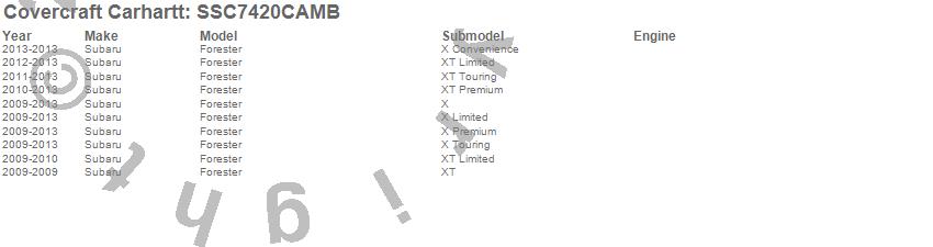 Below is an abbreviated list of applications for the Covercraft Carhartt SeatSaver.Forester, Subaru, 2013, 2012, 2011, 2010, 2009