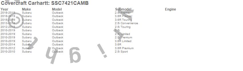 Below is an abbreviated list of applications for the Covercraft Carhartt SeatSaver.Outback, Subaru, 2019, 2018, 2017, 2016, 2015, 2014, 2013, 2012, 2011, 2010