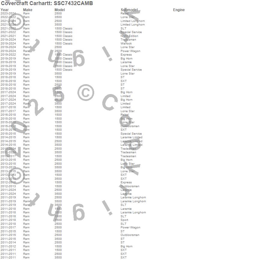 Below is an abbreviated list of applications for the Covercraft Carhartt SeatSaver.1500, 1500 Classic, 2500, 3500, Ram, 2025, 2024, 2023, 2022, 2021, 2020, 2019, 2018, 2017, 2016, 2015, 2014, 2013, 2012, 2011