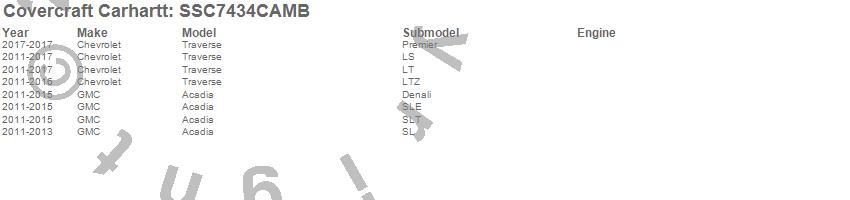 Below is an abbreviated list of applications for the Covercraft Carhartt SeatSaver.Acadia, Traverse, Chevrolet, GMC, 2017, 2016, 2015, 2014, 2013, 2012, 2011