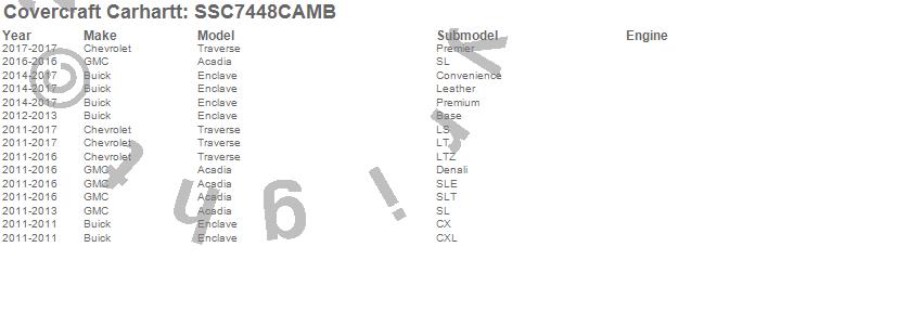 Below is an abbreviated list of applications for the Covercraft Carhartt SeatSaver.Acadia, Enclave, Traverse, Buick, Chevrolet, GMC, 2017, 2016, 2015, 2014, 2013, 2012, 2011