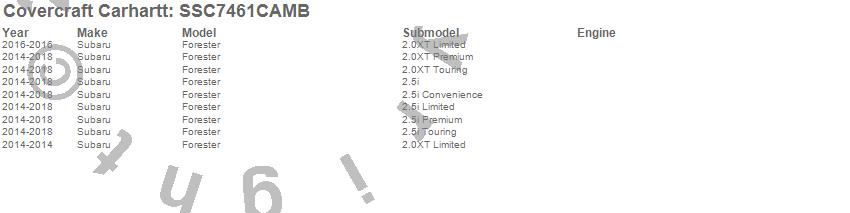 Below is an abbreviated list of applications for the Covercraft Carhartt SeatSaver.Forester, Subaru, 2018, 2017, 2016, 2015, 2014