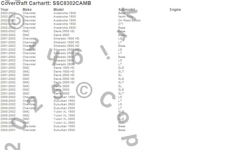Below is an abbreviated list of applications for the Covercraft Carhartt SeatSaver.Avalanche 1500, Avalanche 2500, Sierra 1500 HD, Sierra 2500 HD, Sierra 3500, Silverado 1500 HD, Silverado 2500 HD, Silverado 3500, Suburban 1500, Suburban 2500, Yukon XL 1500, Yukon XL 2500, Chevrolet, GMC, 2002, 2001, 2000